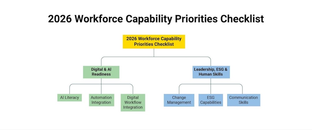 - Key workforce priorities for 2026 include AI literacy, digital transformation, ESG, leadership, automation readiness, and graduate development.
