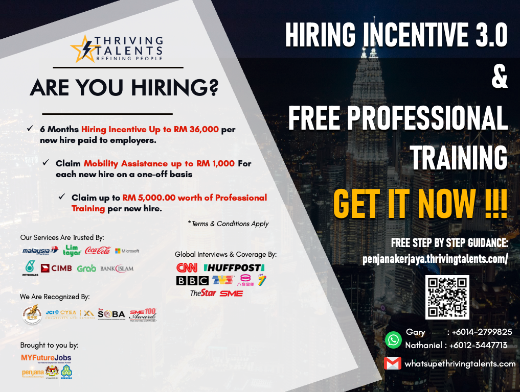We are proud to Announce that Thriving Talents is a Registered Training Provider of the “RM2BIL PENJANA KERJAYA 3.0 HIRING & TRAINING INCENTIVE” Programme.