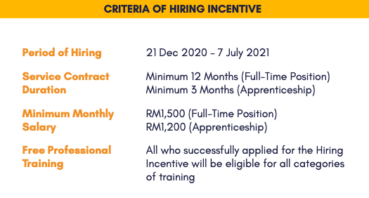6 Months Hiring Incentive Up to RM36,000 per new hire paid to employers.